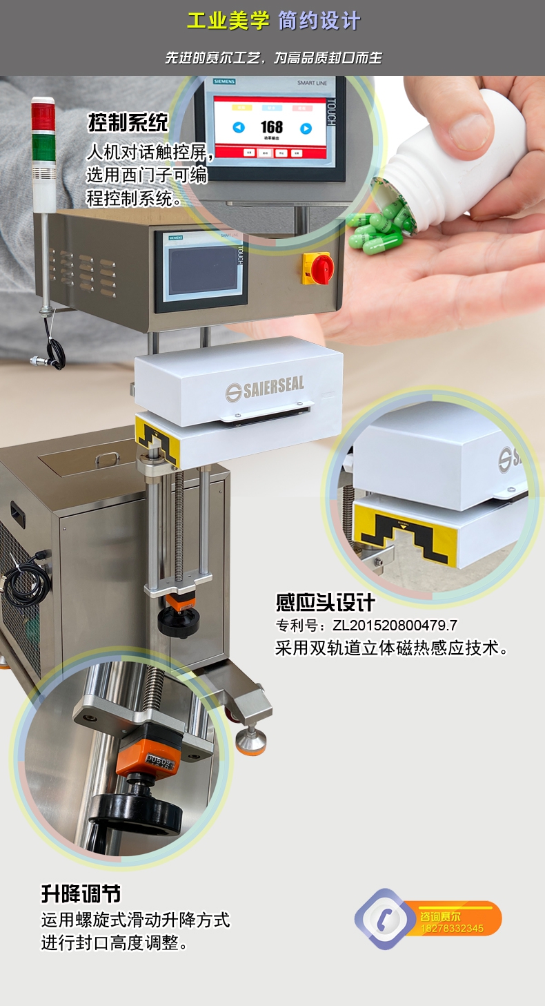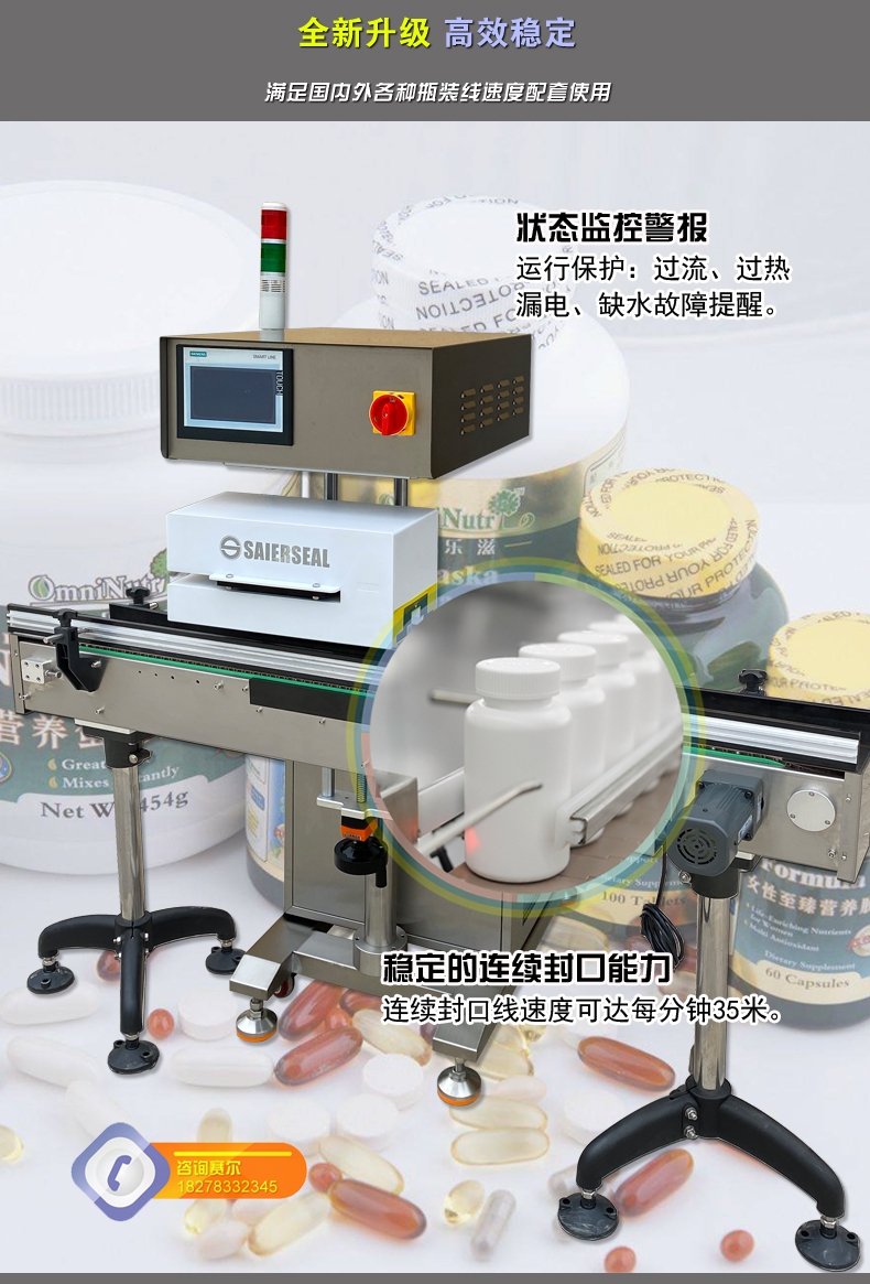 本機(jī)型封口通用性強(qiáng),配置先進(jìn),操作簡單,滿足瓶裝線的連續(xù)封口要求,可針對(duì)不同化工物料的性狀特點(diǎn)進(jìn)行封口強(qiáng)度調(diào)節(jié),達(dá)到美觀牢固的產(chǎn)品密封目的;本型號(hào)參照美系進(jìn)口鋁箔封口機(jī)的技術(shù)指標(biāo),結(jié)合國內(nèi)化工廠普遍的封口需求進(jìn)行技術(shù)升級(jí),做到了穩(wěn)定性好、兼容性高、使用率強(qiáng),并具備抗磁干擾、耐腐防潮、漏電保護(hù)、異常報(bào)警、堵瓶檢測等多項(xiàng)先進(jìn)功能,是一款能達(dá)到嚴(yán)格封口,滿足自動(dòng)瓶裝線可靠封口的電磁感應(yīng)鋁箔封口機(jī)。