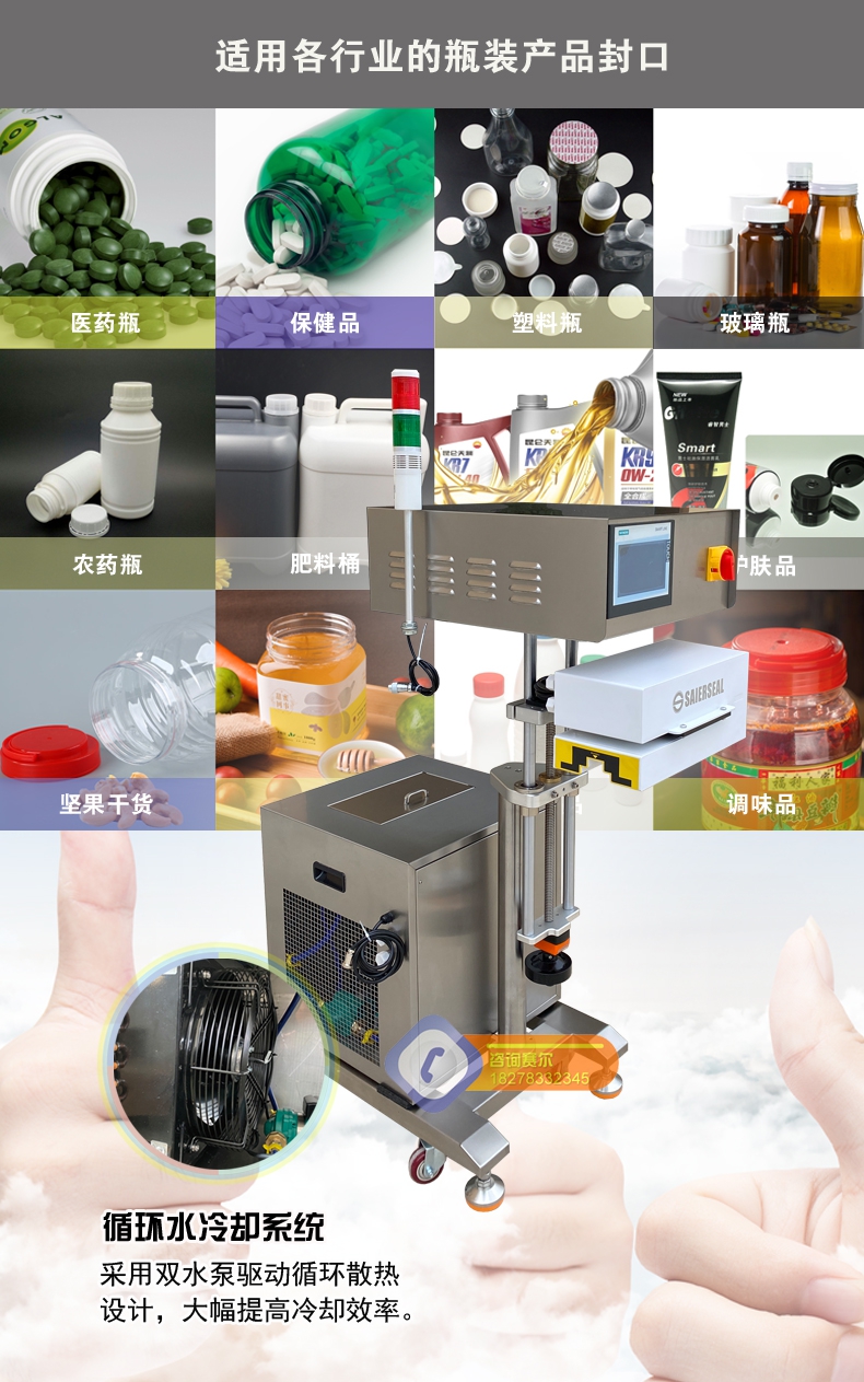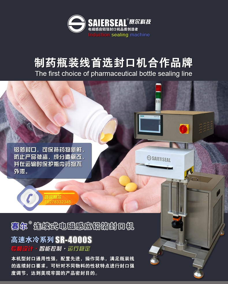 SR-4000S水冷式電磁感應(yīng)鋁箔封口機(jī)應(yīng)用于瓶口密封,可防止產(chǎn)品遭篡改,保持藥物新鮮,防止被盜,并在運(yùn)輸時(shí)保護(hù)藥劑或藥粉不外泄。