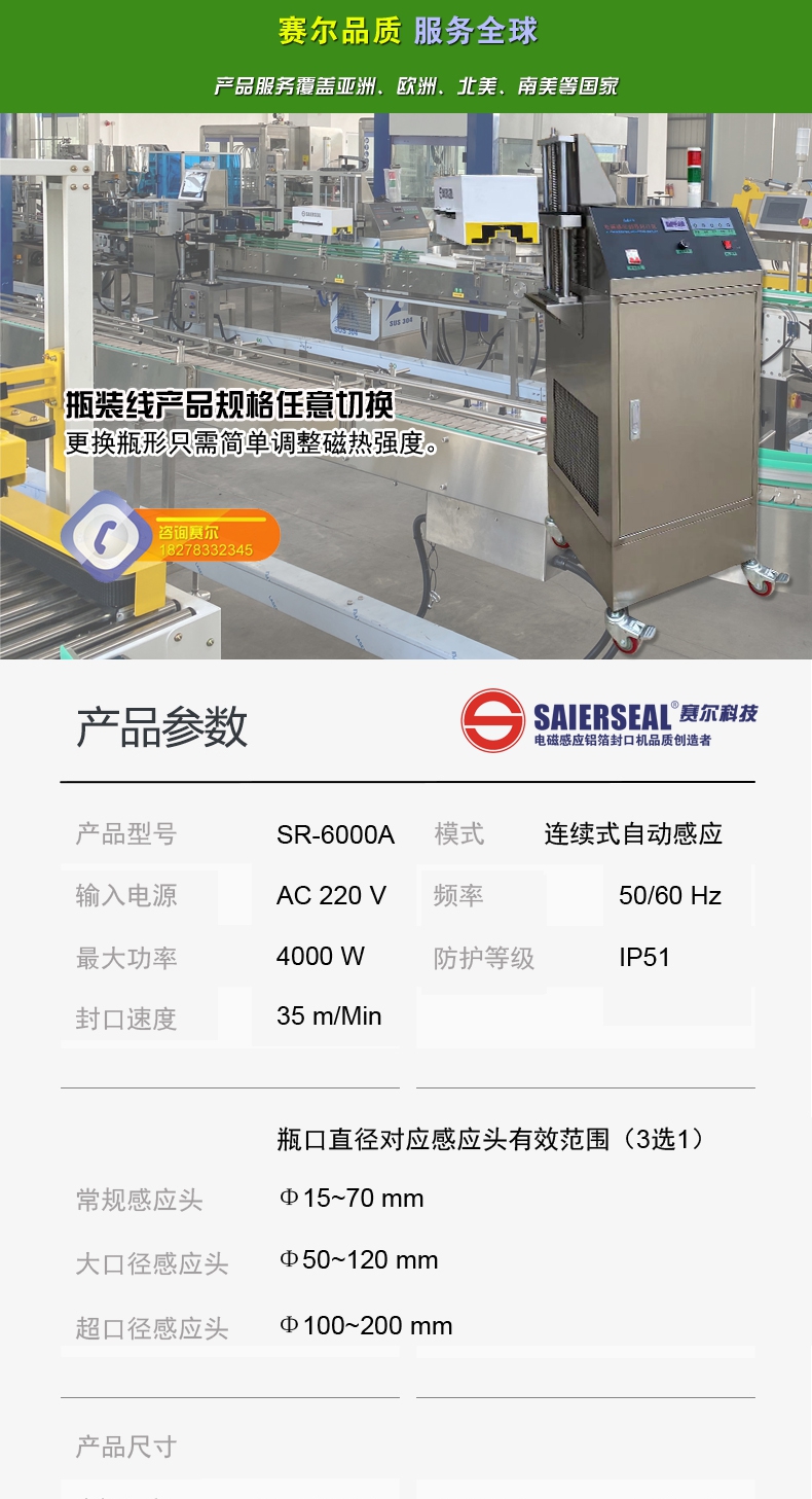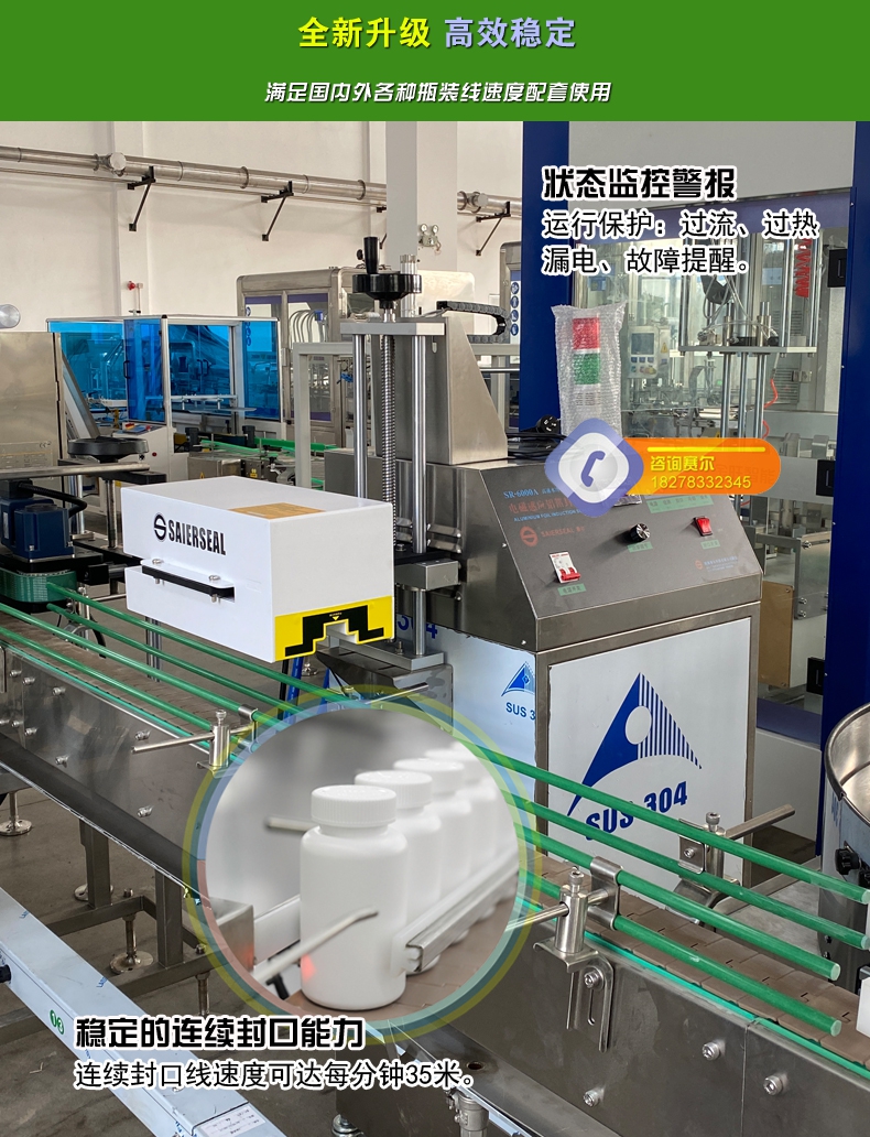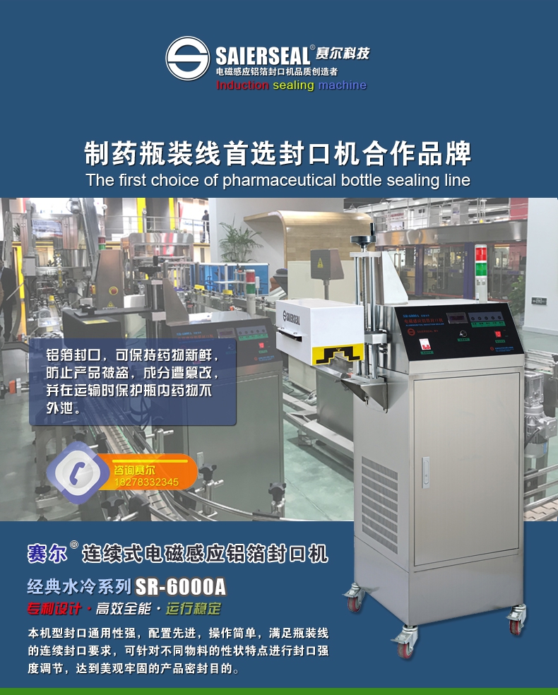 SR-6000A水冷式電磁感應(yīng)鋁箔封口機(jī)應(yīng)用于瓶口密封,可防止產(chǎn)品遭篡改,保持藥物新鮮,防止被盜,并在運(yùn)輸時(shí)保護(hù)藥劑或藥粉不外泄。