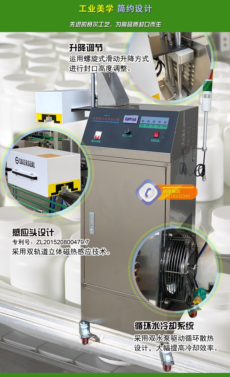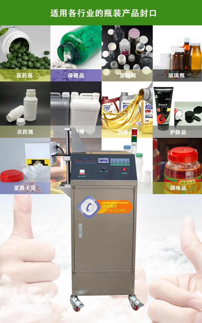 本機(jī)型封口通用性強(qiáng),配置先進(jìn),操作簡(jiǎn)單,滿足瓶裝線的連續(xù)封口要求,可針對(duì)不同化工物料的性狀特點(diǎn)進(jìn)行封口強(qiáng)度調(diào)節(jié),達(dá)到美觀牢固的產(chǎn)品密封目的;本型號(hào)參照美系進(jìn)口鋁箔封口機(jī)的技術(shù)指標(biāo),結(jié)合國(guó)內(nèi)化工廠普遍的封口需求進(jìn)行技術(shù)升級(jí),做到了穩(wěn)定性好、兼容性高、使用率強(qiáng),并具備抗磁干擾、耐腐防潮、漏電保護(hù)、異常報(bào)警等多項(xiàng)先進(jìn)功能,是一款能達(dá)到嚴(yán)格封口,滿足自動(dòng)瓶裝線可靠封口的電磁感應(yīng)鋁箔封口機(jī)。